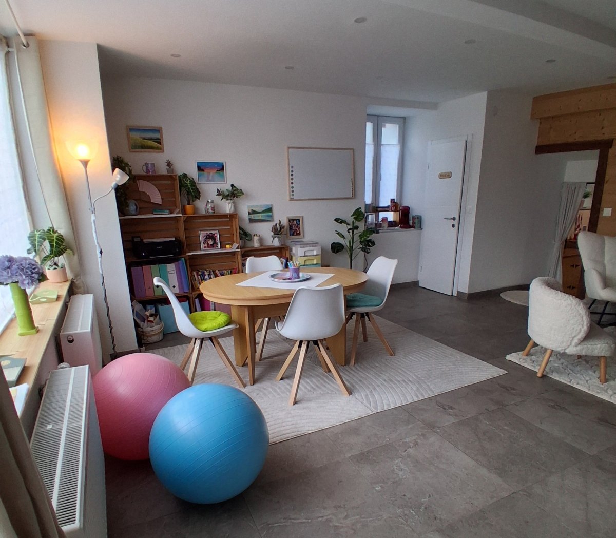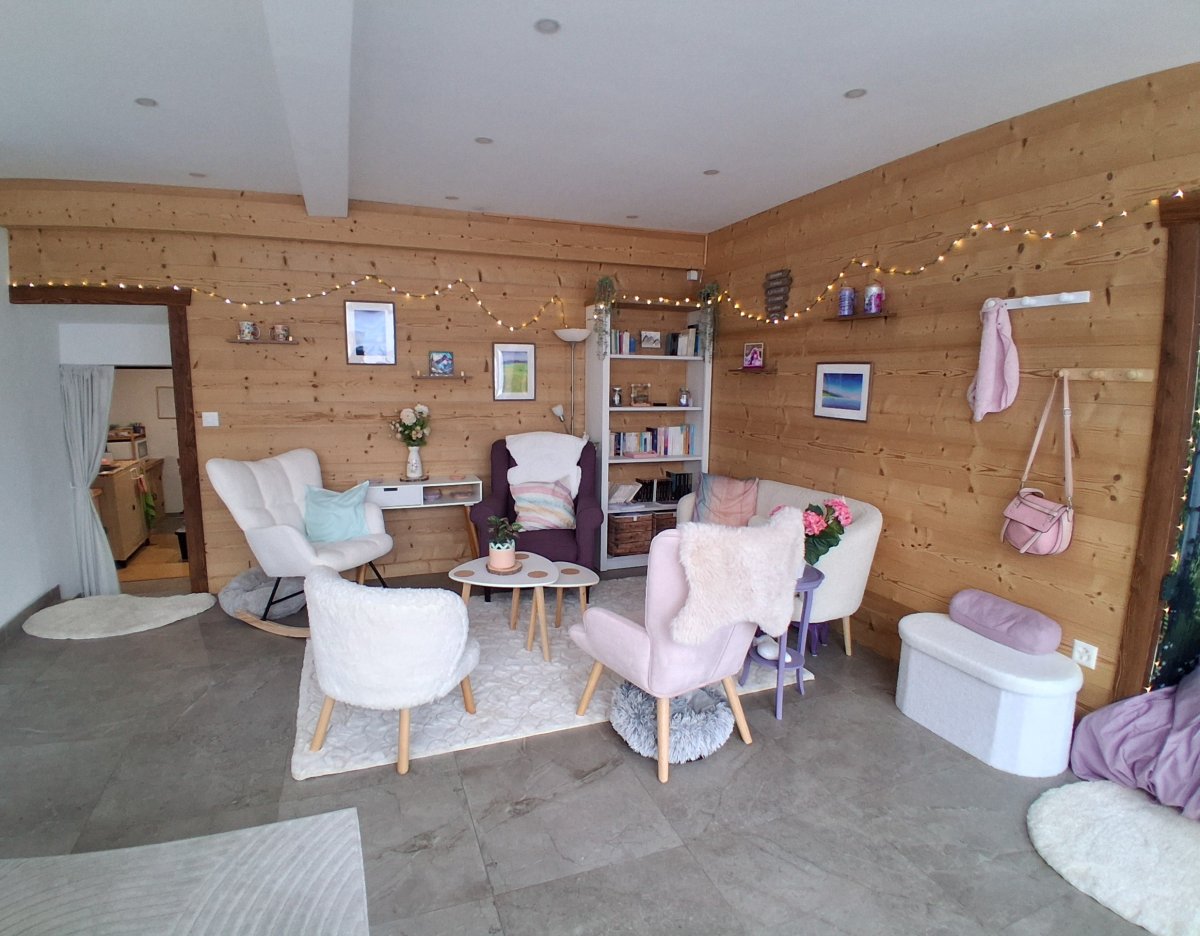 Un espace accueillant et cosy avec des livres à disposition, un espace de travail, un bar à café (ou thé) et un refuge sensoriel.