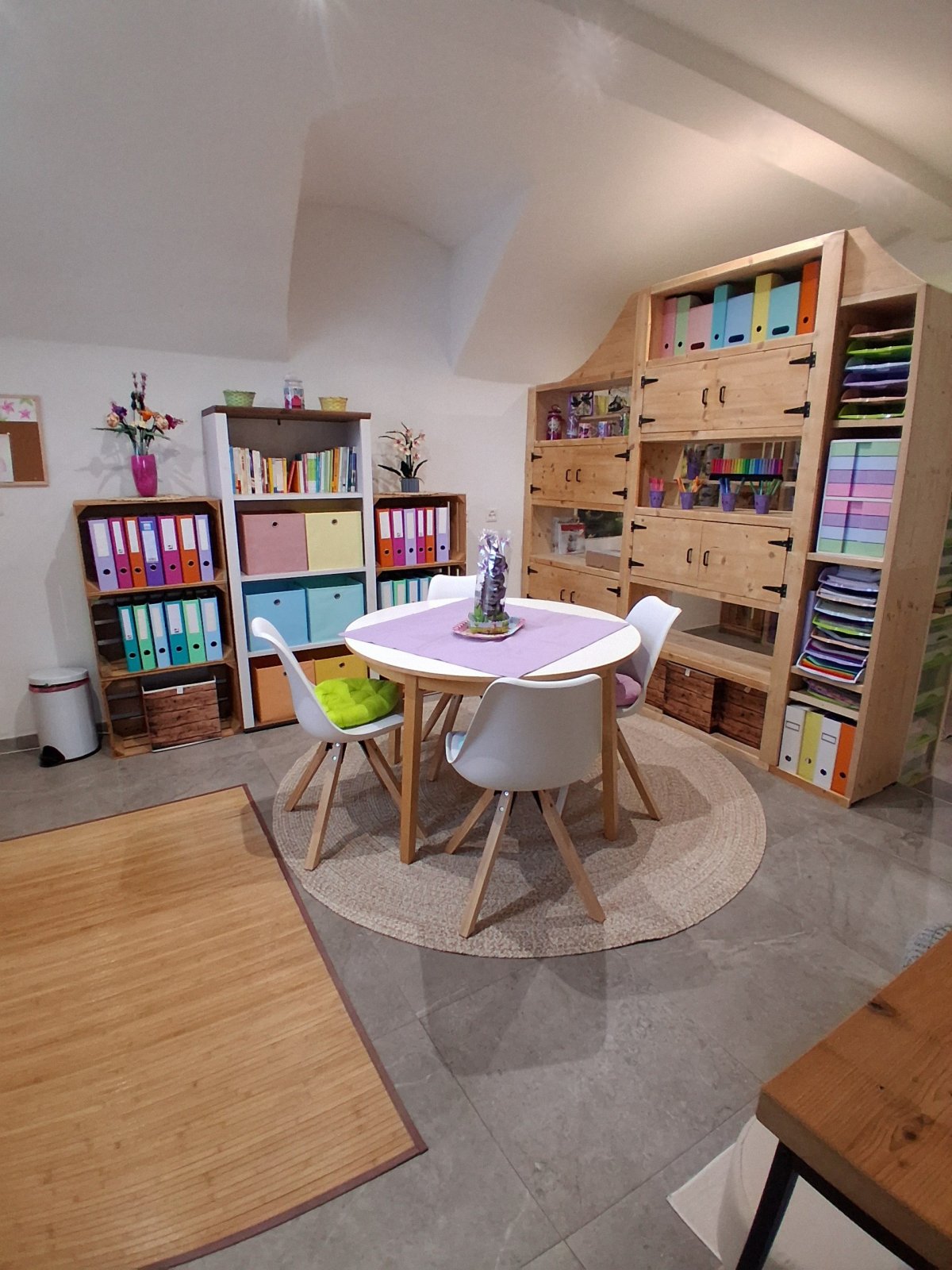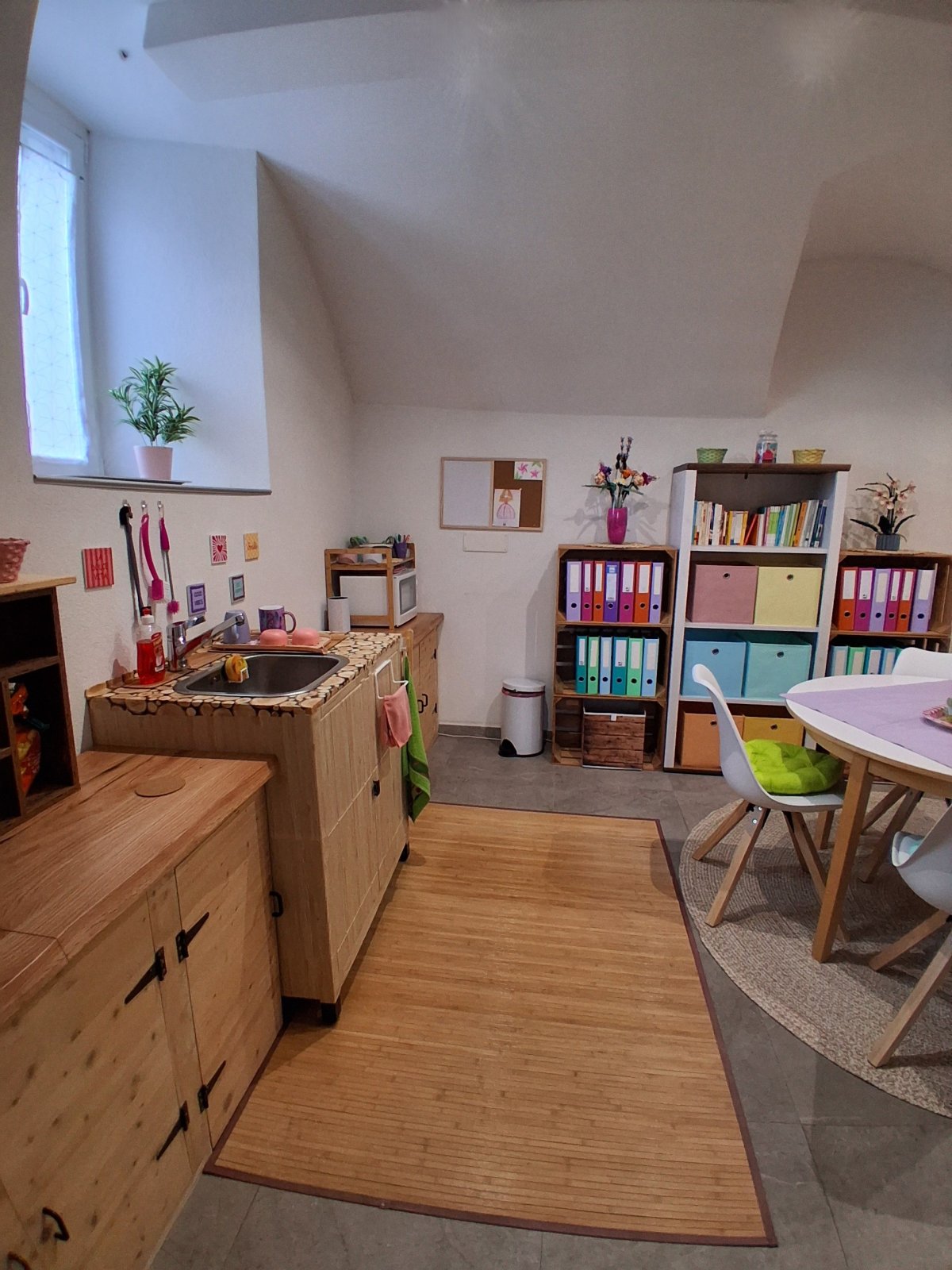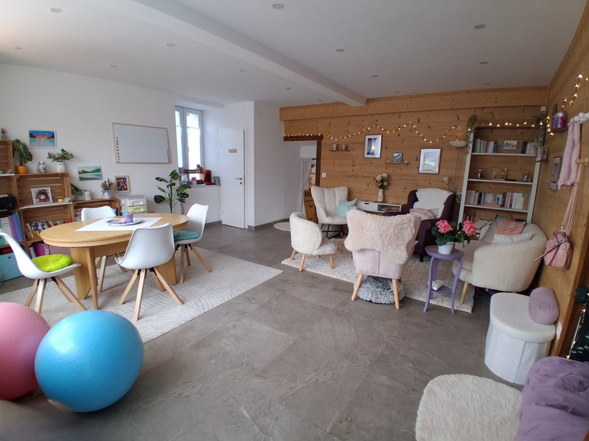 Avec un deuxième espace à l'arrière, avec une kitchenette, un espace de travail supplémentaire, et le coin des animaux.
